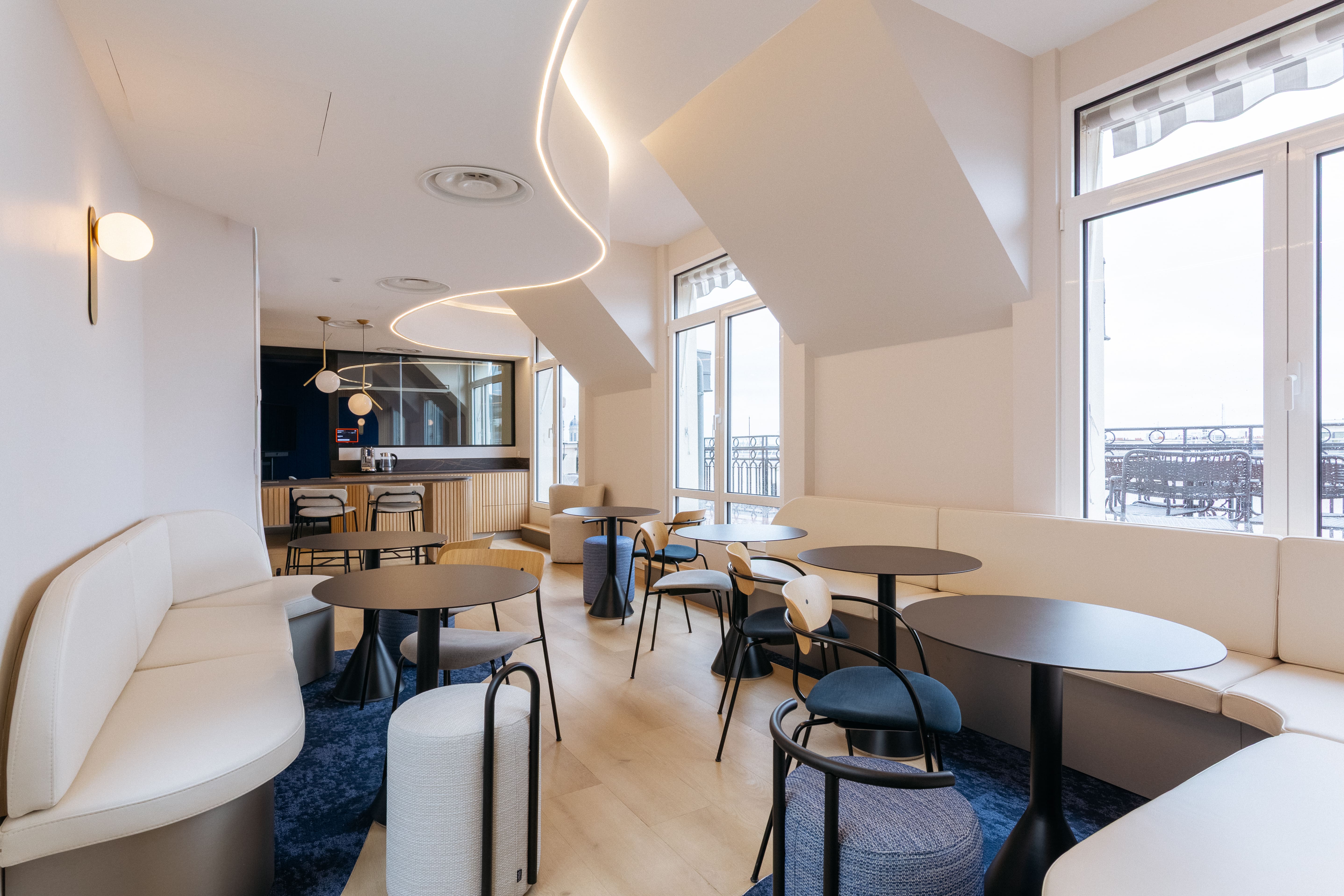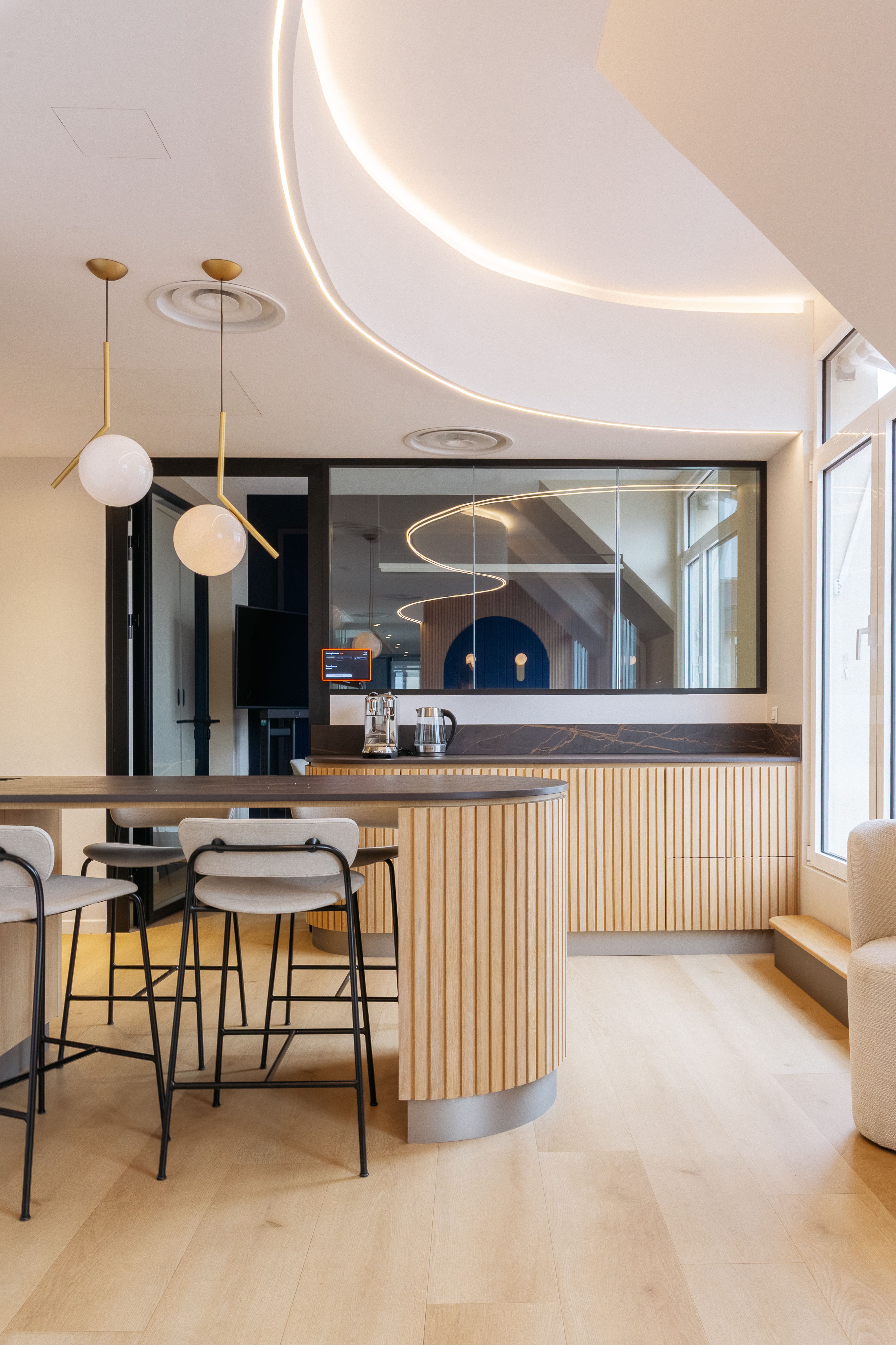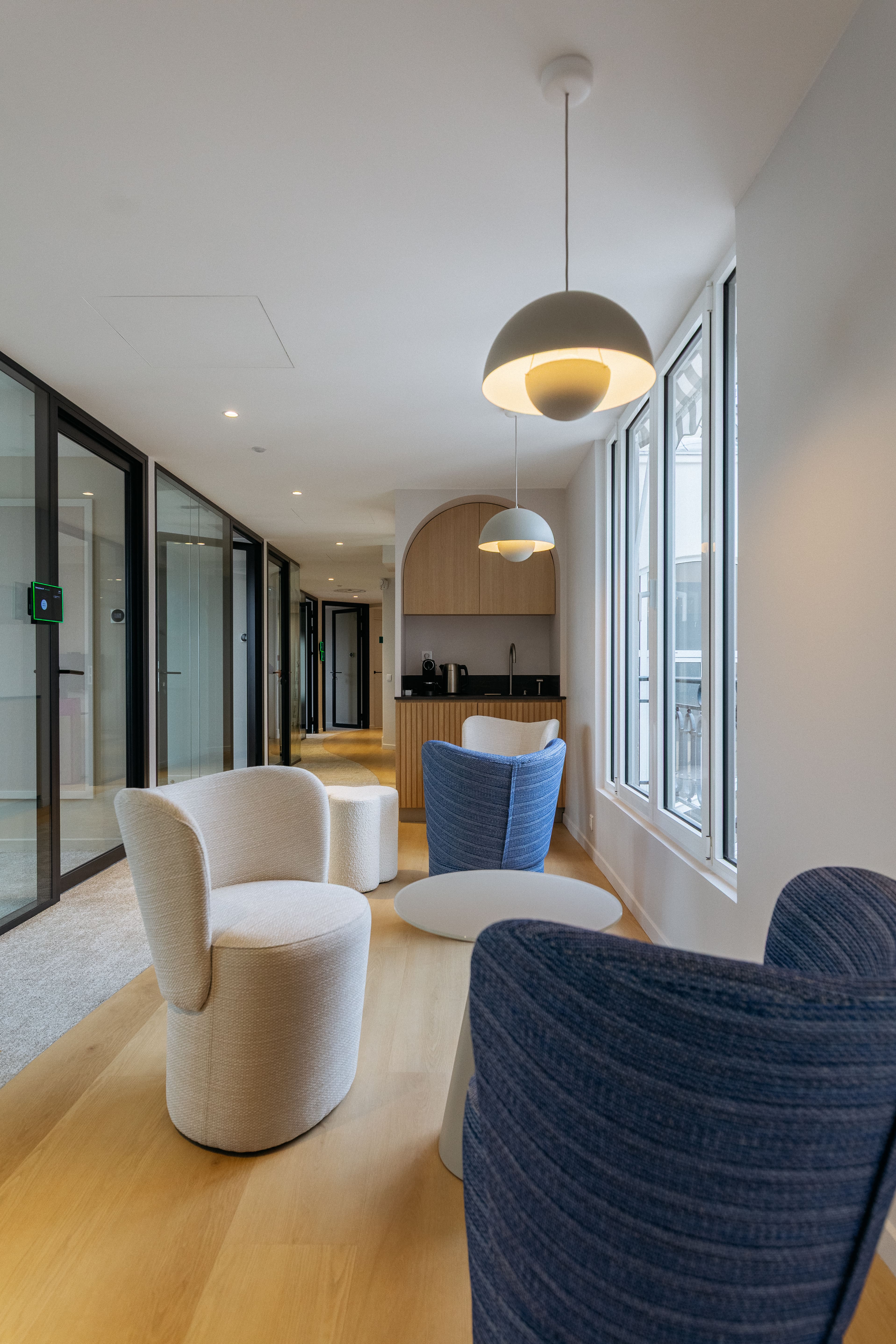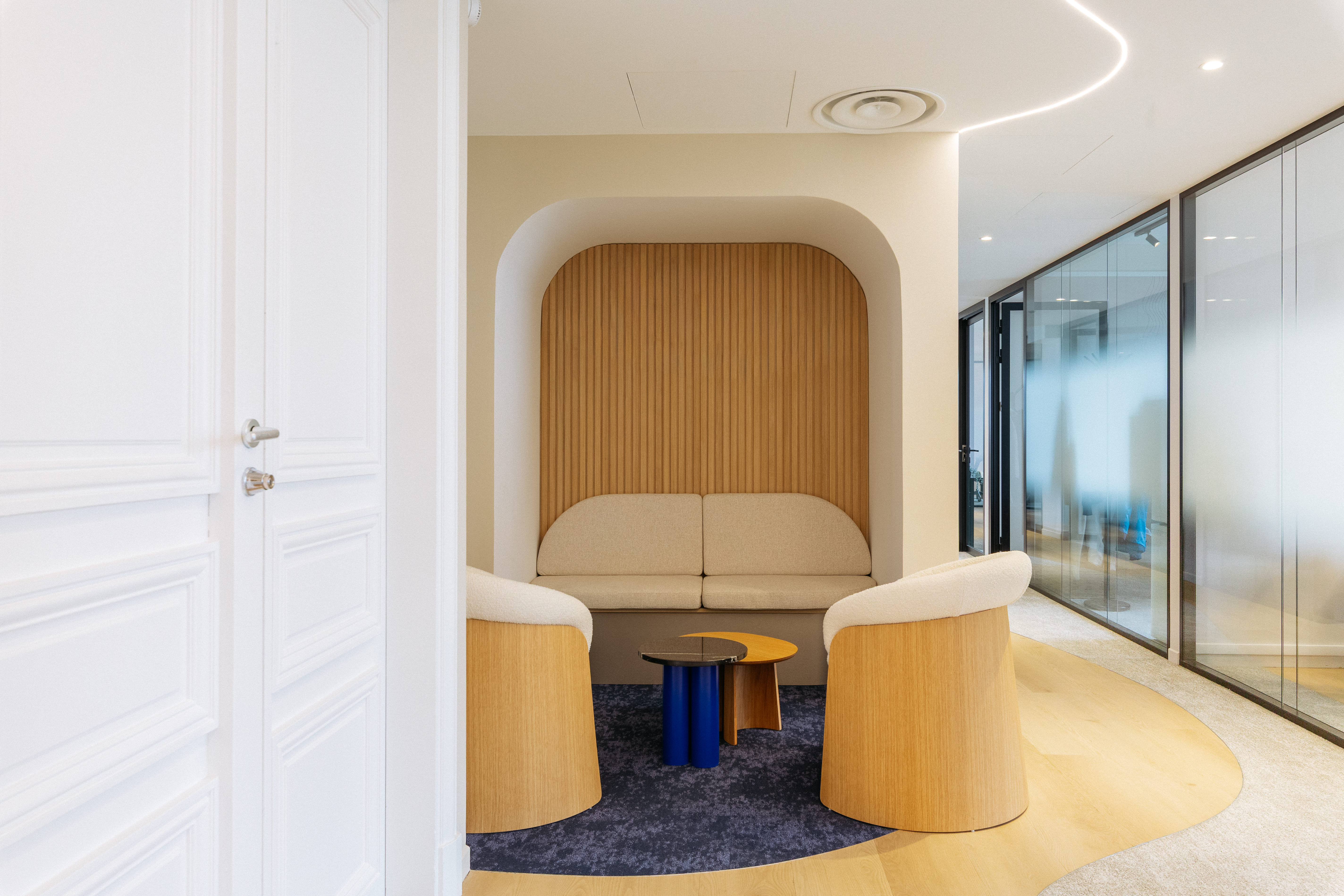 Le Studio Bluedigo a conçu une identité visuelle forte autour d'une esthétique minimaliste et maîtrisée. Tons neutres, lignes claires, matériaux soigneusement sélectionnés : des espaces d'accueil aux salles de réunion, en passant par les postes de travail, la tisanerie et la cafétéria, chaque zone a été pensée pour offrir une atmosphère soignée et cocooning, alliant raffinement des matières et douceur de l'ambiance pour faire de chaque pièce un vrai lieu de bien-être.