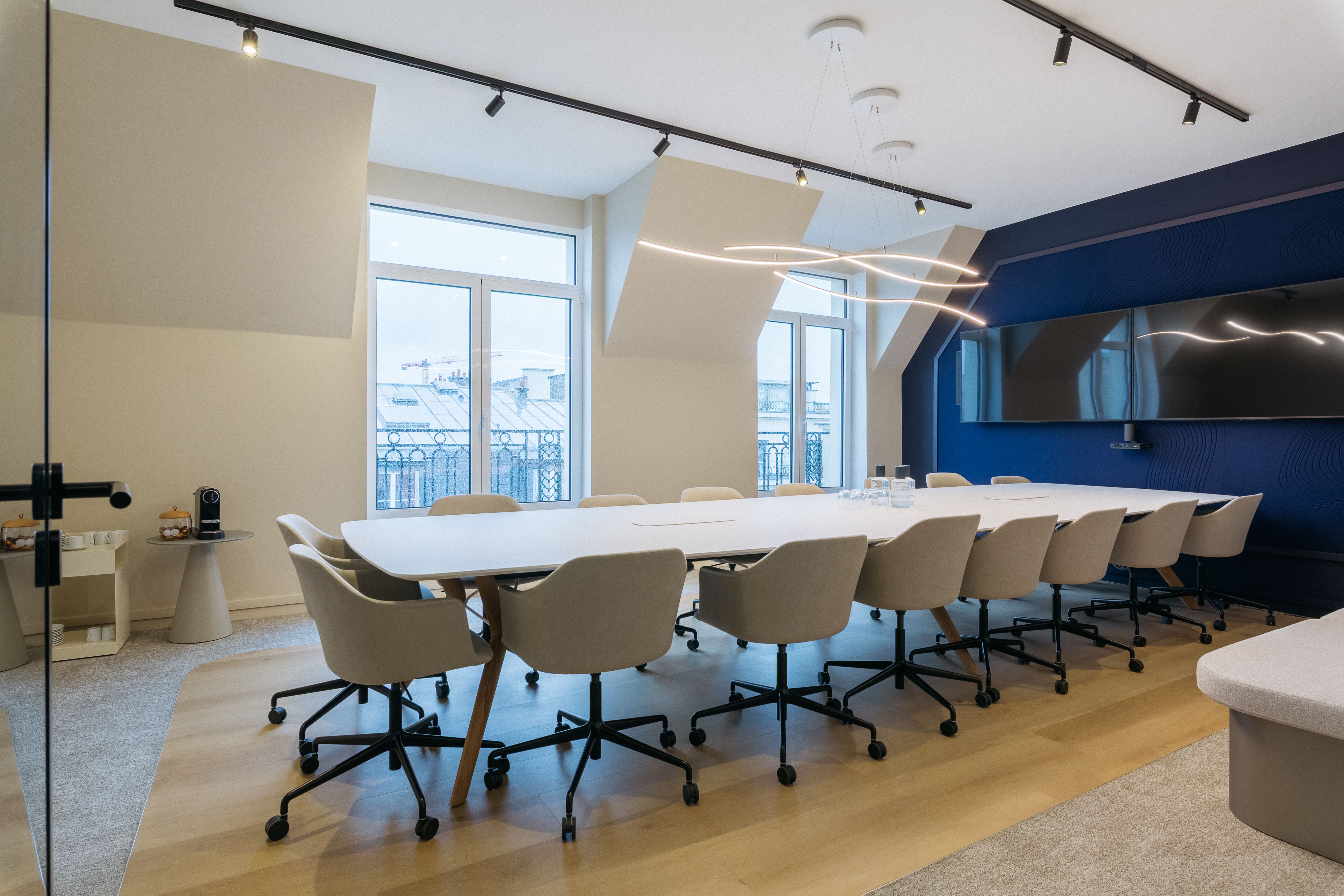 Dans le 8ème arrondissement de Paris, ce fonds d'investissement souhaitait aménager ses bureaux avec exigence : un environnement élégant, sobre et cohérent, qui reflète son identité tout en affirmant un engagement concret pour une économie plus durable. Bluedigo a accompagné le projet de A à Z, de la définition de l'ambiance au choix du mobilier et de la décoration, pour un rendu design et raffiné, sans compromis sur les valeurs.