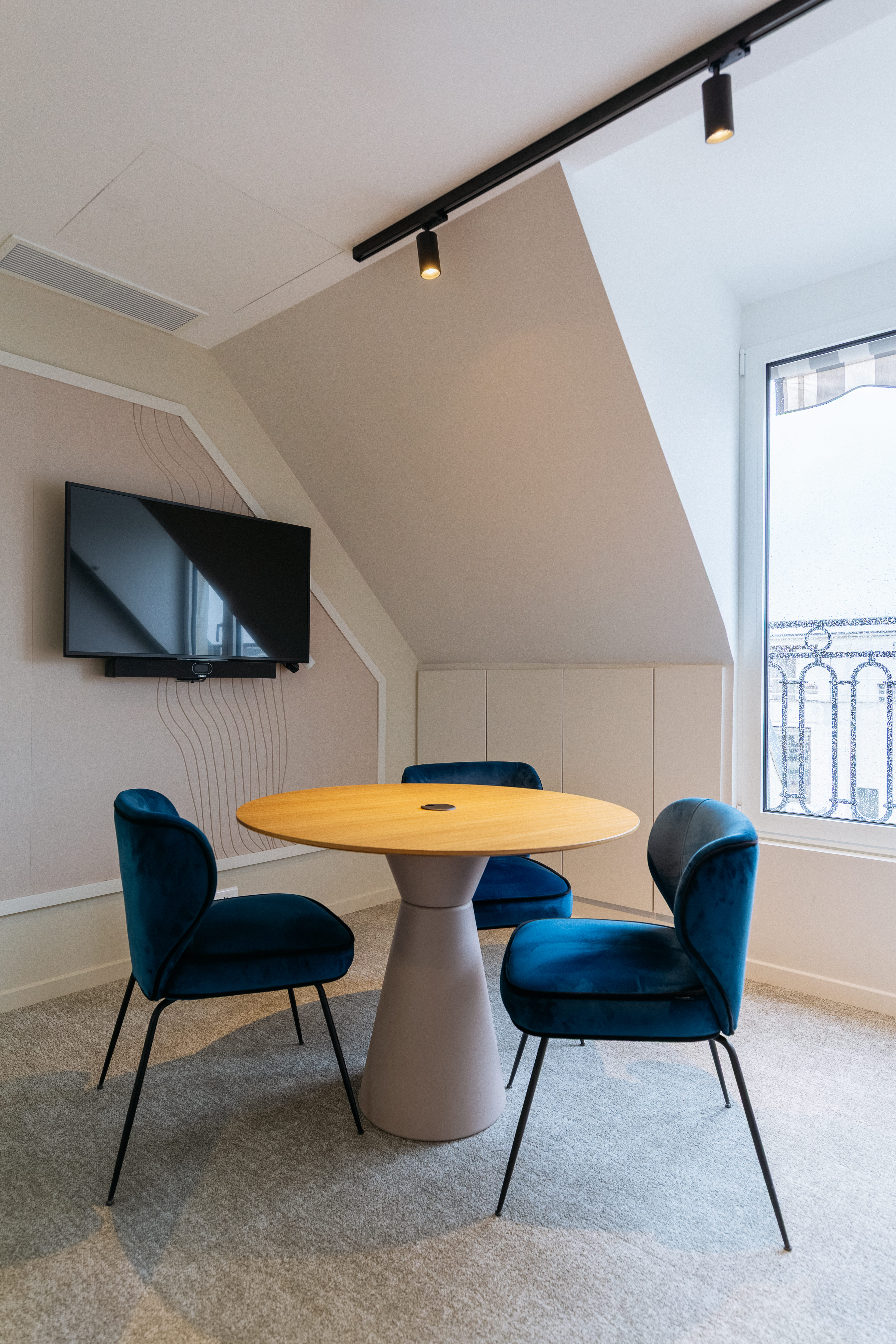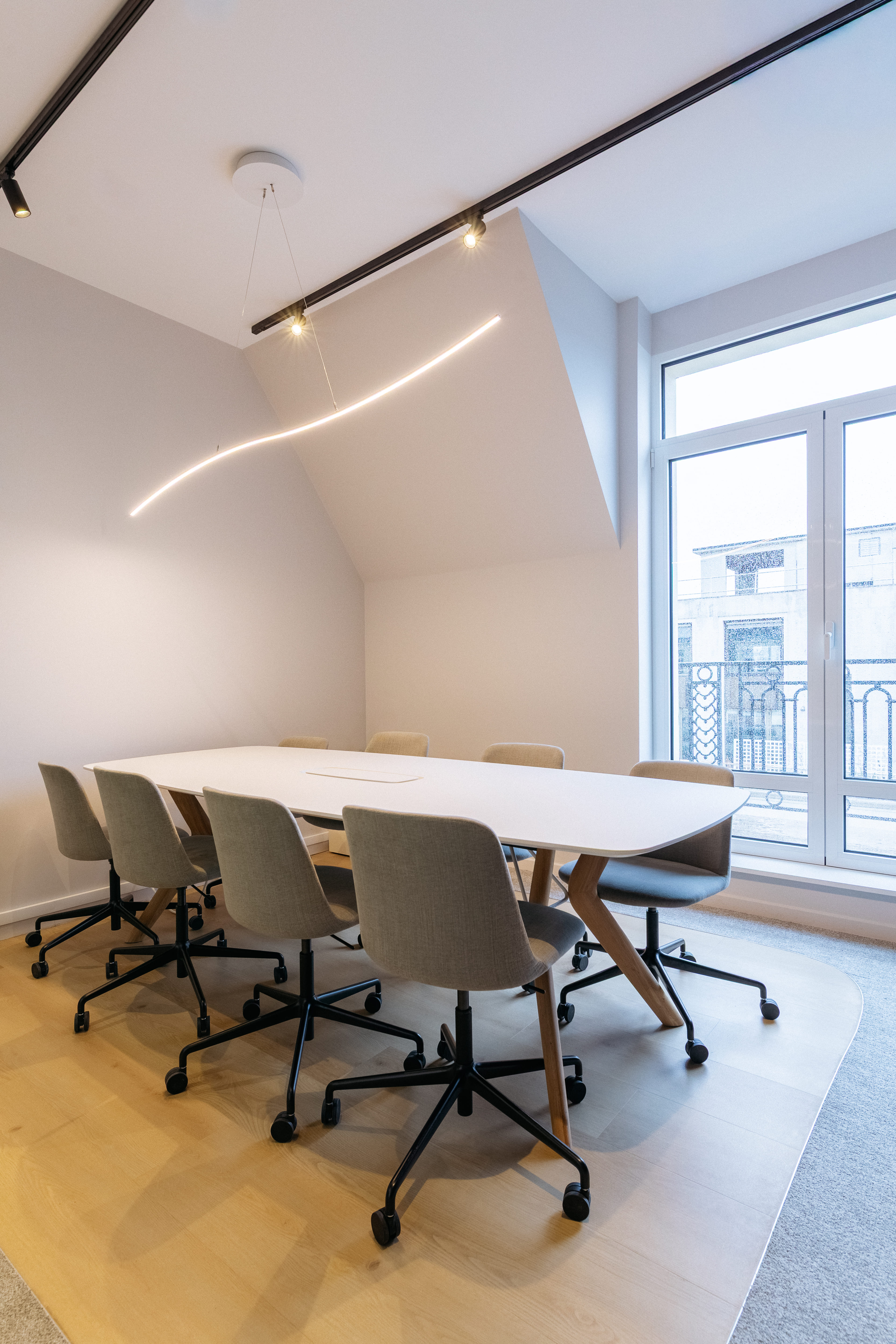 Chaque pièce a été choisie pour son alignement avec les valeurs de Bluedigo : durabilité, simplicité et usage. Les bureaux électriques Buronomic et les chaises Eurosit, deux marques françaises, structurent des postes de travail ergonomiques et durables. Les tables de réunion Mobitek et les fauteuils d'accueil Ondaretta, complètent les espaces avec sobriété et caractère. En fil conducteur, des luminaires en forme de vague signés Henri Bursztyn, conçus sur-mesure et fabriqués 100% en France, apportent la touche signature du projet.